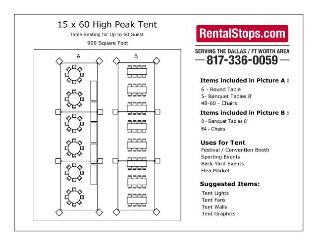 * Please call us for any questions on our 15 foot x 60 foot marquee tent rentals in Dallas, Fort Worth, Plano, Garland, Carrollton, Arlington TX, and DFW Metro Area.